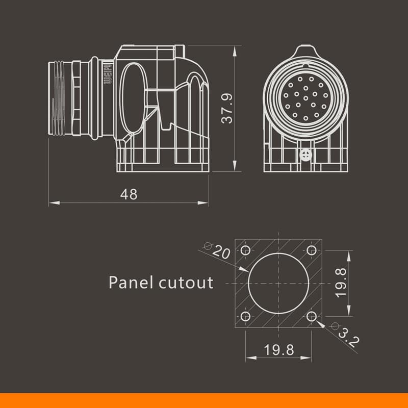 | 07、Female contact angled square flange receptacle | e、Coded chuck N: Gray (Standard), S:Black (Special order),H: Orange (Special order), X: Blue (Special order),Y: Green (Special order), Z: Purple (Special order) |