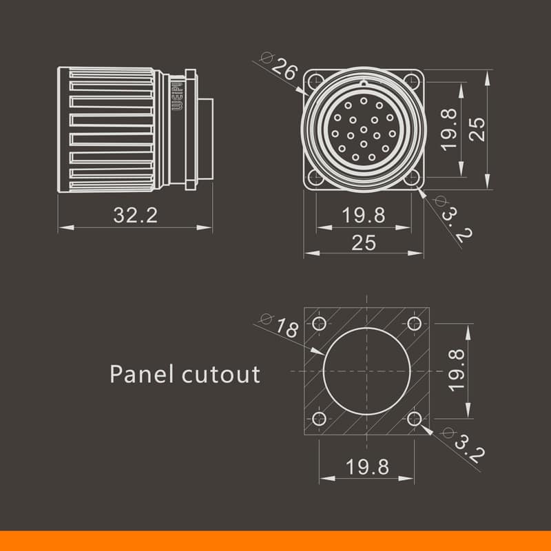 | 07、Female contact angled square flange receptacle | e、Coded chuck N: Gray (Standard), S:Black (Special order),H: Orange (Special order), X: Blue (Special order),Y: Green (Special order), Z: Purple (Special order) |