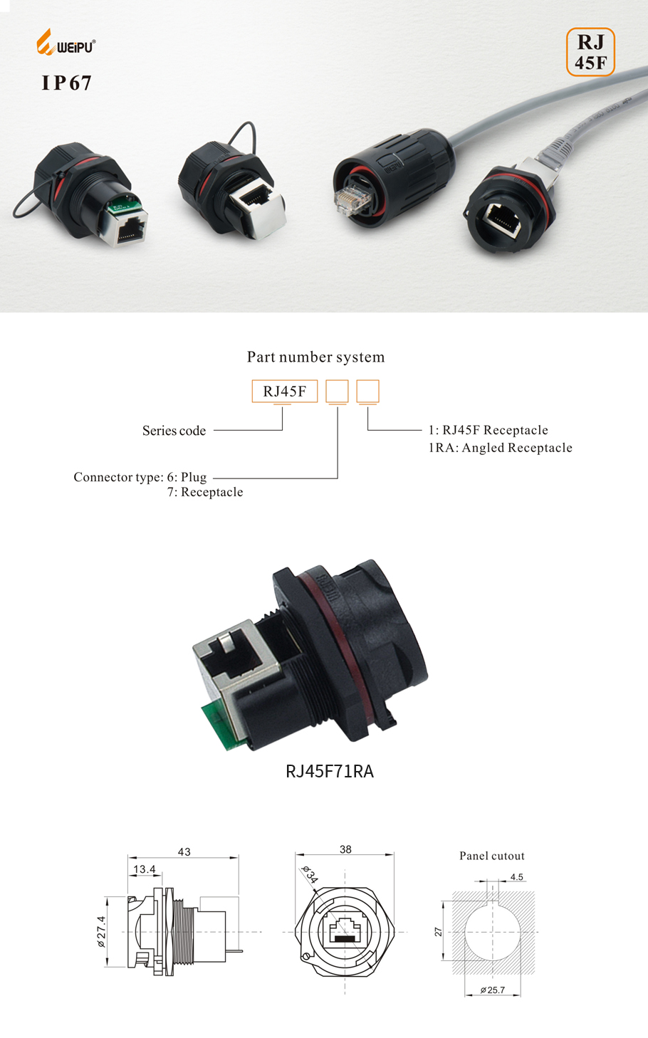 RJ45F connector is used to connect standard Ethernct Class D /Cat.5e and Class E/cat 6(10 Base T,100 basc TX, 1000 Base T net works ) in outdoor or water proof harsh working environment . no need soldering,easy to connect, it is widely use in communications,LED boards,security monitoring,automation control etc.