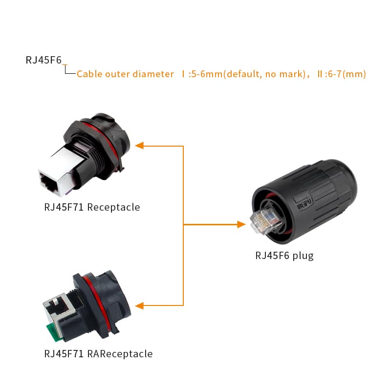 RJ45F connector is used to connect standard Ethernct Class D /Cat.5e and Class E/cat 6(10 Base T,100 basc TX, 1000 Base T net works ) in outdoor or water proof harsh working environment . no need soldering,easy to connect, it is widely use in communications,LED boards,security monitoring,automation control etc.