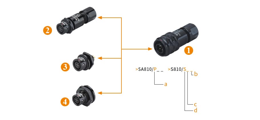 | 02、In-line cable connector(>SA811/P_ _ >SA811/S_ _) | b、Colour:B: Black S: Silver L: Blue(special order) G: Green(special order) |