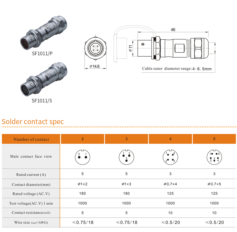 | Termination | Solder:SF6,SF8,SF10,SF12,SF16,SF20 Crimp:SF16,SF20 Screw:SF20(2.5mm contact) |
