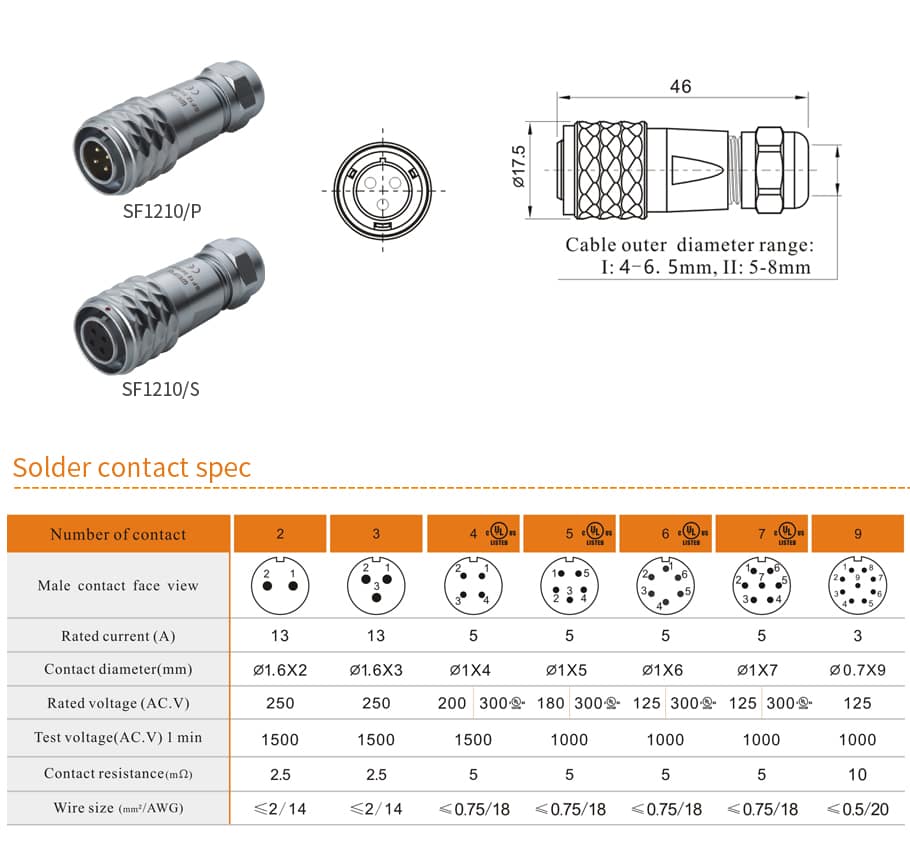 | Termination | Solder:SF6,SF8,SF10,SF12,SF16,SF20 Crimp:SF16,SF20 Screw:SF20(2.5mm contact) |