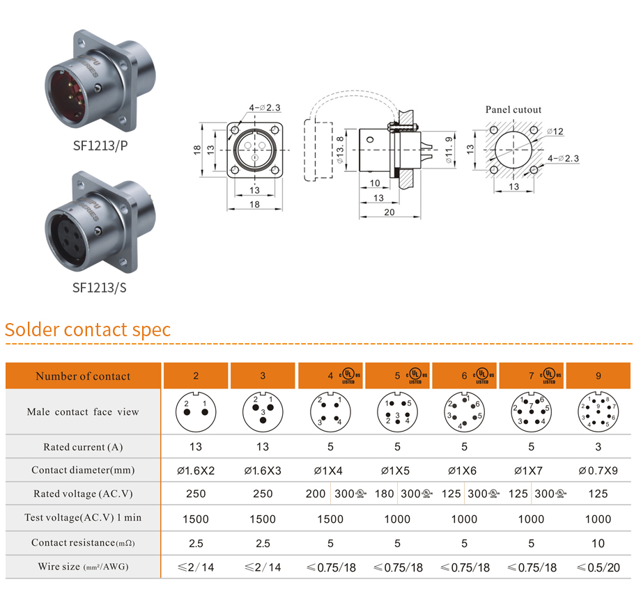 | Termination | Solder:SF6,SF8,SF10,SF12,SF16,SF20 Crimp:SF16,SF20 Screw:SF20(2.5mm contact) |