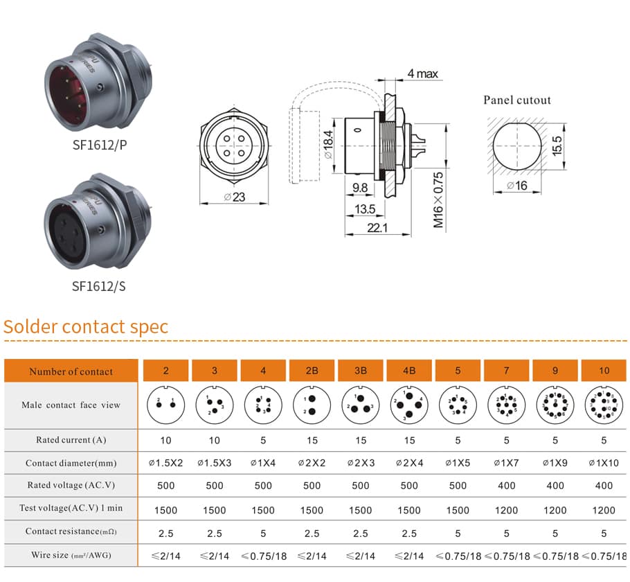| Termination | Solder:SF6,SF8,SF10,SF12,SF16,SF20 Crimp:SF16,SF20 Screw:SF20(2.5mm contact) |