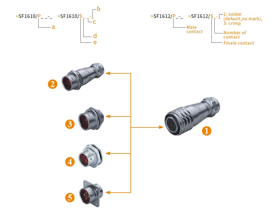 | 02、In-line cable connector(>SF1611/P_ _-_ >SF1611/S_ _-_) | b、1: solder(default,no mark), 3: crimp |