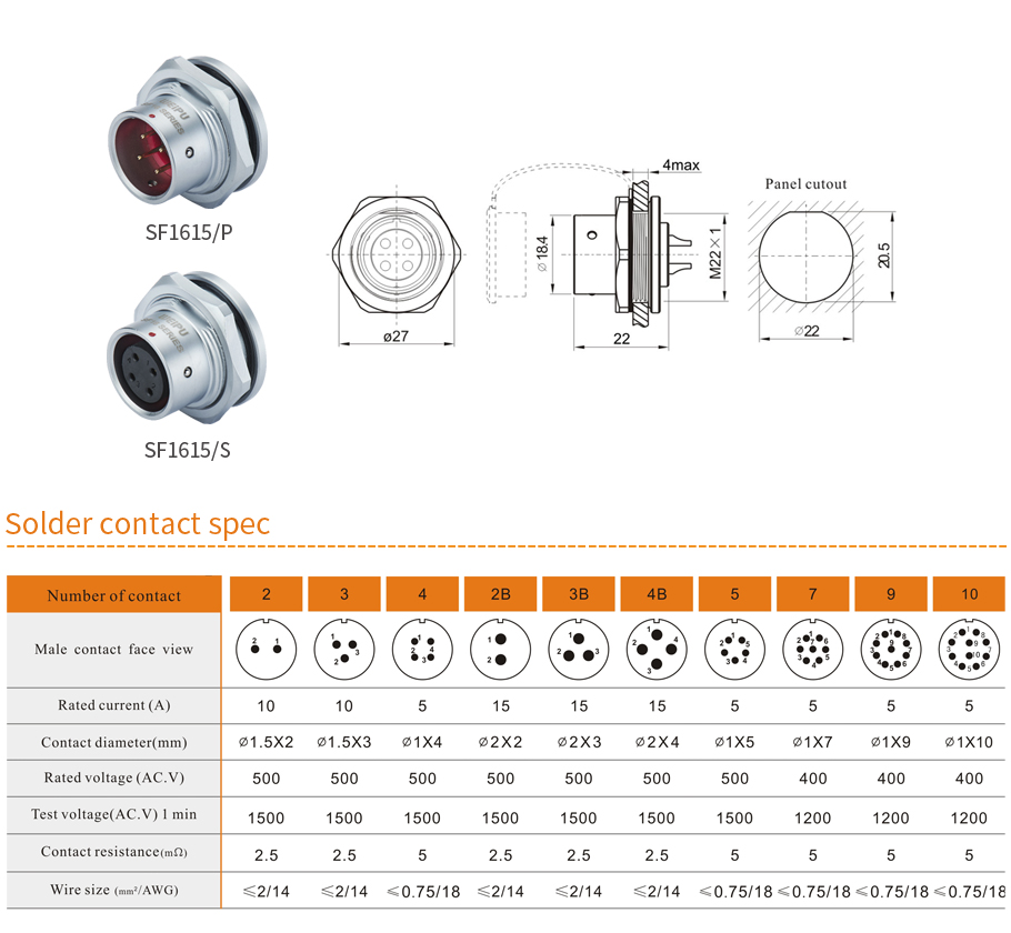 | Termination | Solder:SF6,SF8,SF10,SF12,SF16,SF20 Crimp:SF16,SF20 Screw:SF20(2.5mm contact) |