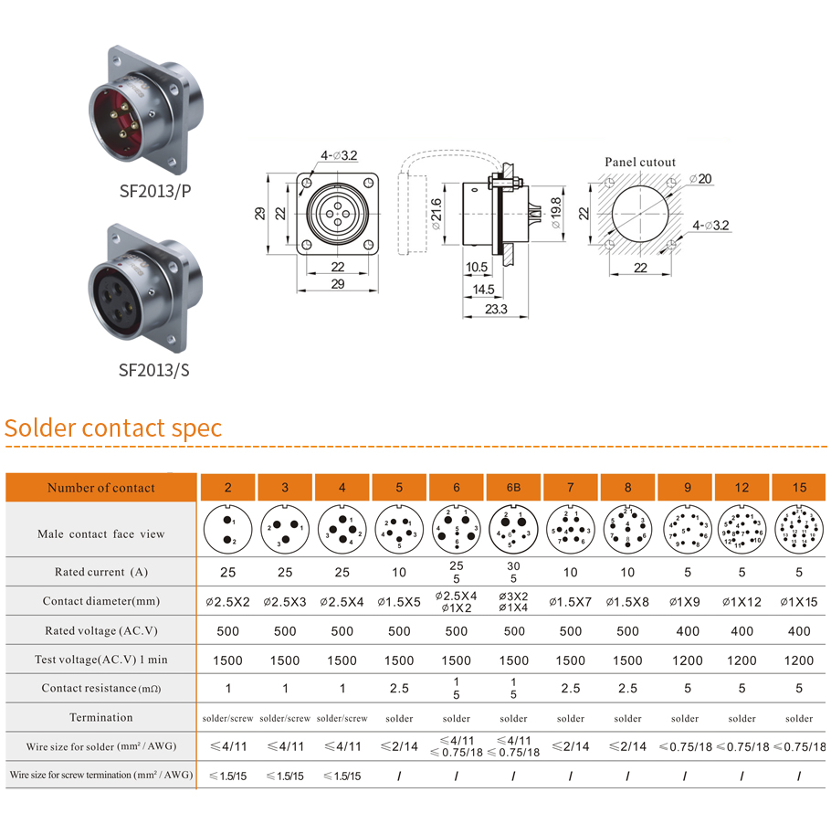 | Termination | Solder:SF6,SF8,SF10,SF12,SF16,SF20 Crimp:SF16,SF20 Screw:SF20(2.5mm contact) |