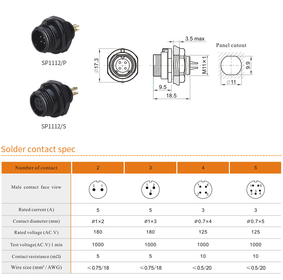 | Termination | Solder: SP13, SP17, SP21, SP29 Crimp: SP17,SP21,SP29 Screw: SP21, SP29 (02.5,03,03.5mm contact) |