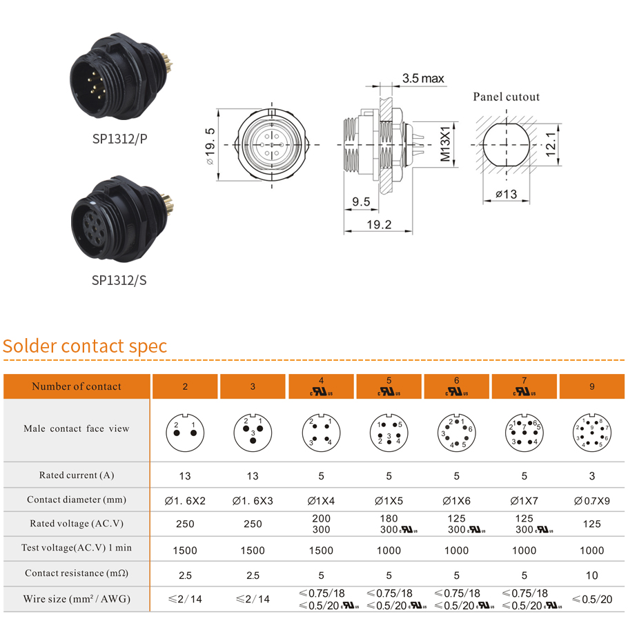 | Termination | Solder: SP13, SP17, SP21, SP29 Crimp: SP17,SP21,SP29 Screw: SP21, SP29 (02.5,03,03.5mm contact) |