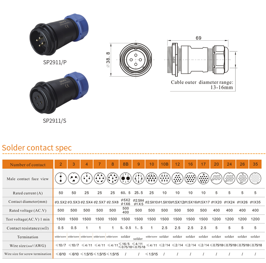 | Termination | Solder: SP13, SP17, SP21, SP29 Crimp: SP17,SP21,SP29 Screw: SP21, SP29 (02.5,03,03.5mm contact) |