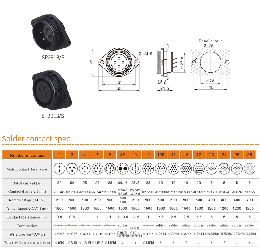 | Termination | Solder: SP13, SP17, SP21, SP29 Crimp: SP17,SP21,SP29 Screw: SP21, SP29 (02.5,03,03.5mm contact) |