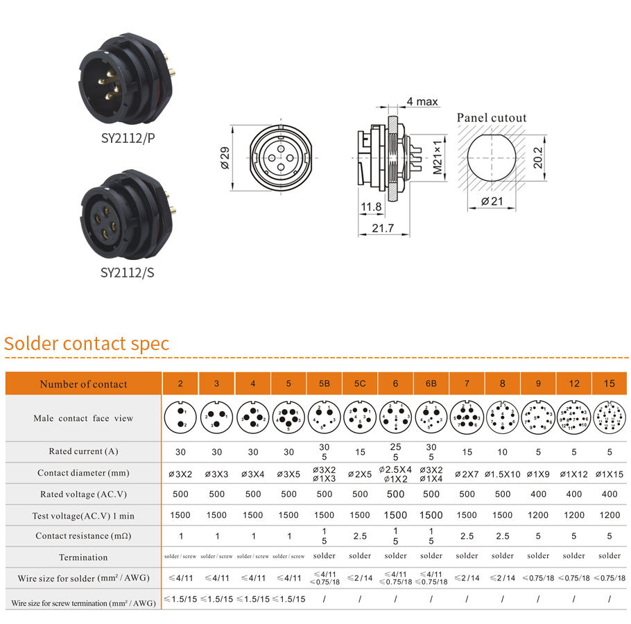 | 04、Rear-nut mount(>SY2112/P_-_ >SY2112/S_-_) | d、1: solder(default,no mark), 2: screw, 3: crimp |