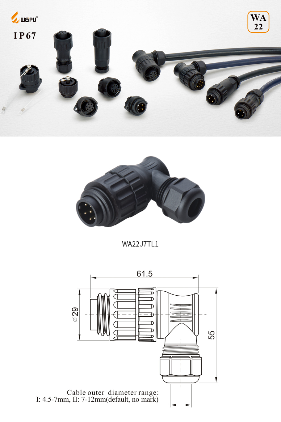| 03、WA22J7TL1 (6+PE male cable connector with angled back shell, solder termination) |