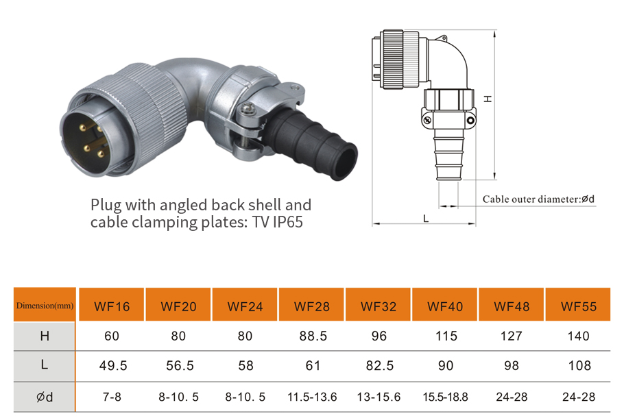 | 06、Plug with angled back shell and metal clamping-nut IP65 | 16、In-line receptacle with cable clamping plates IP65 |