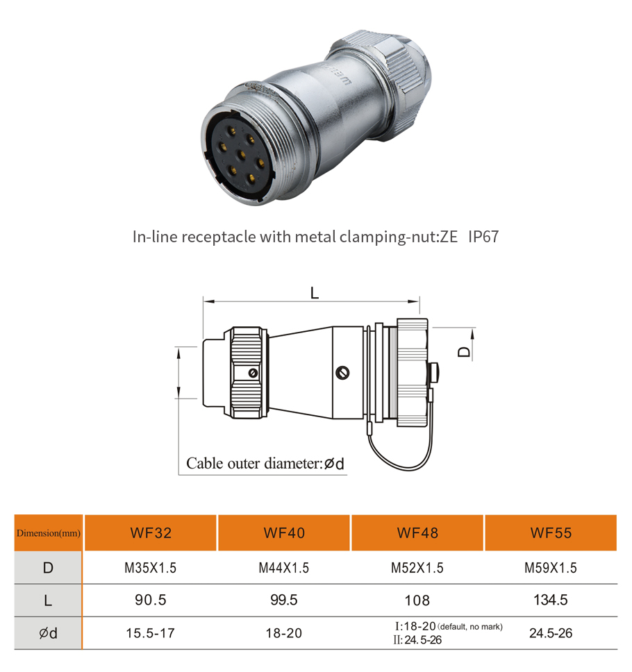 WF-ZE Series In-line receptacle with metal clamping-nut IP67