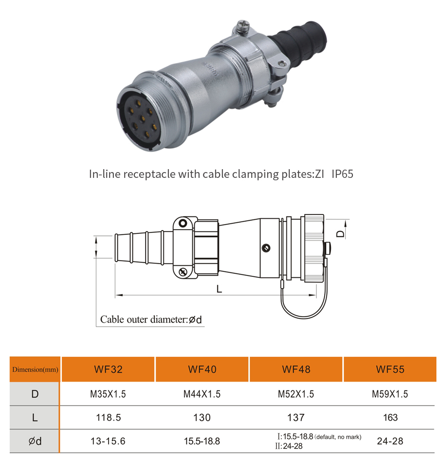 WF-ZI Series In-line receptacle with cable clamping plates IP65