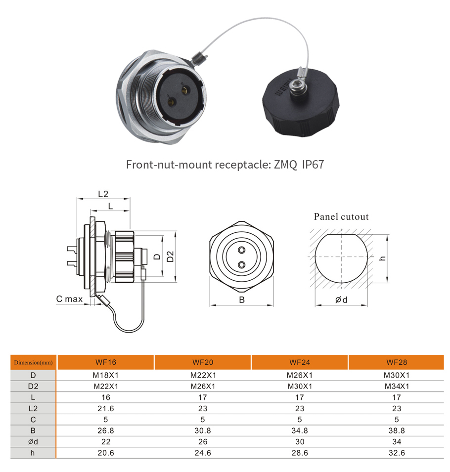 | 01、Plug with plastic clamping-nut IP65 | 11、Front-nut-mount receptacle IP67 |