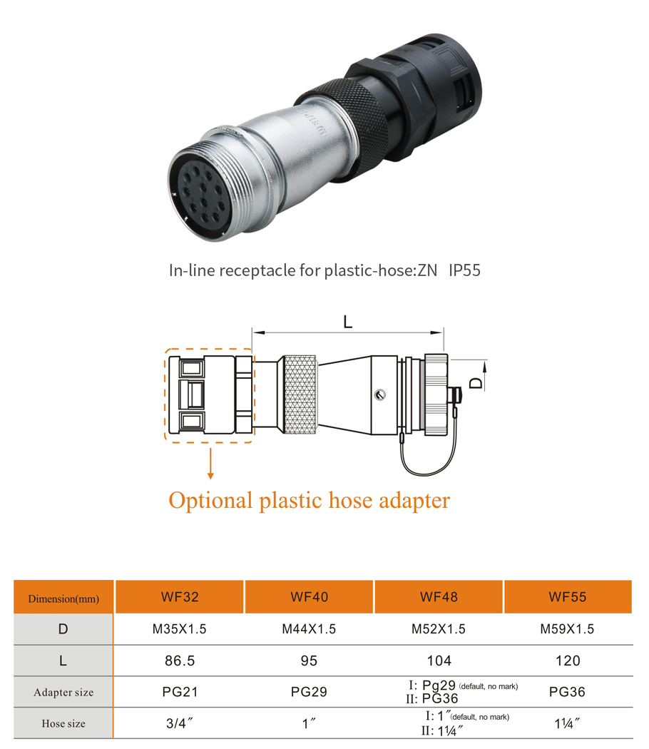 | 04、Plug with cable clamping plates IP65 | 14、In-line receptacle for plastic-hose IP55 |