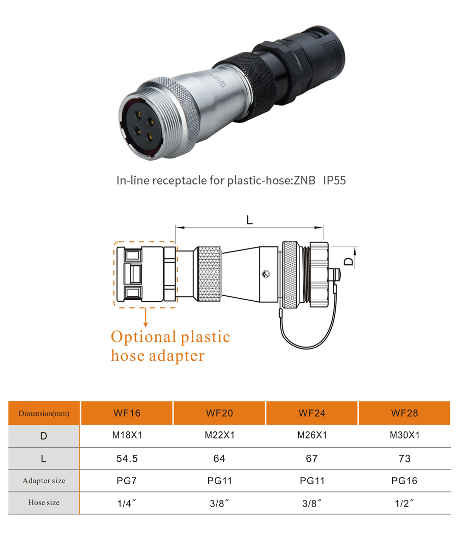 | 04、Plug with cable clamping plates IP65 | 14、In-line receptacle for plastic-hose IP55 |
