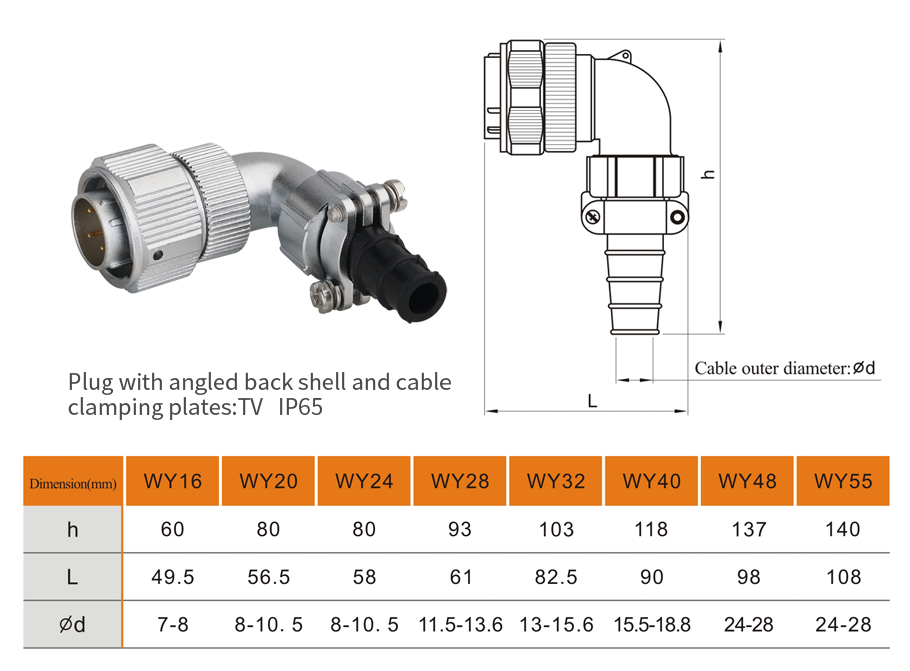 | 05、Plug with angled back shell and metal clamping-nut IP66 | 13、In-line receptacle with cable clamping plates IP65 |