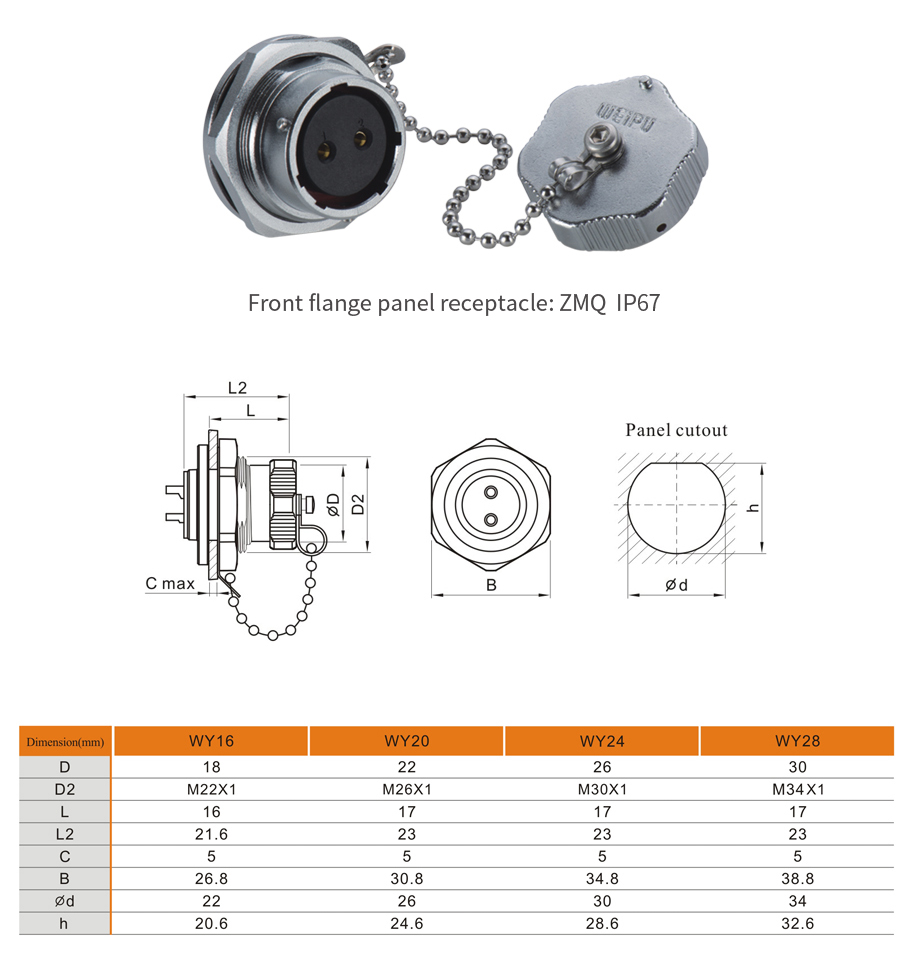 | 02、Plug with cable clamping plates IP65 | 10、Front flange panel receptacle IP67 |