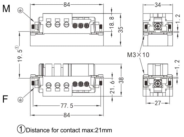 HK-006/-M/F Crimp termination Connector 100A 690V 6+PE +6 Signal pin 16A 400V