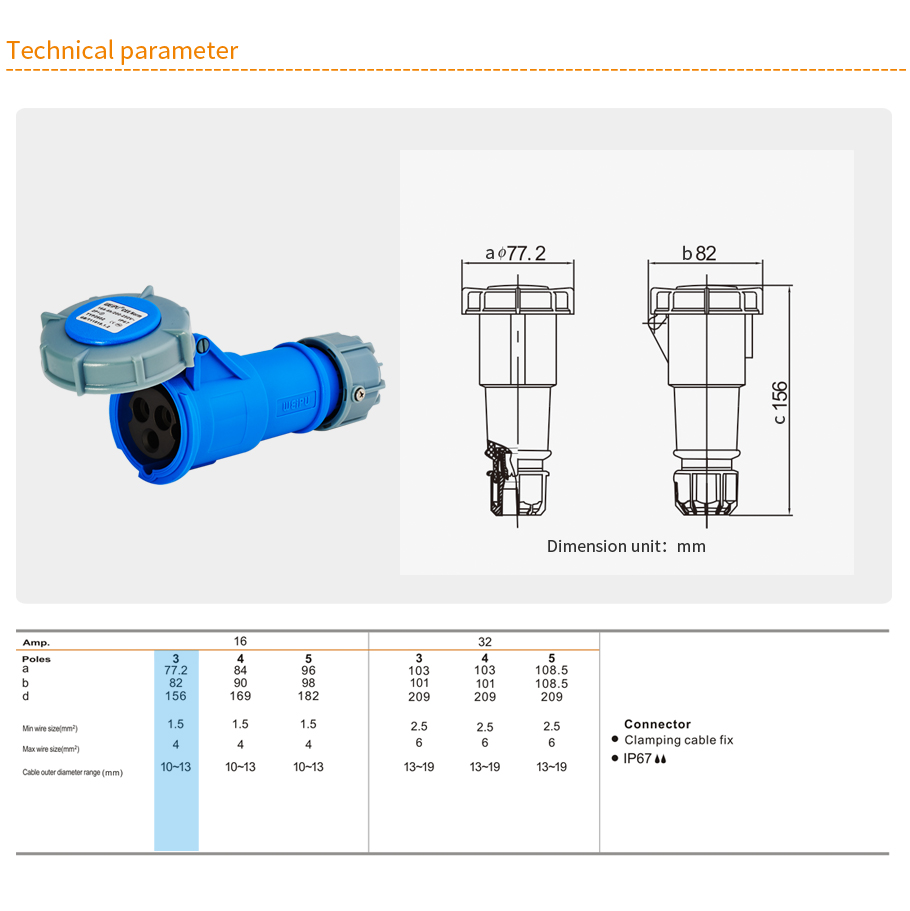16A 3PIN Clamping cable fix TYP2602-IP67