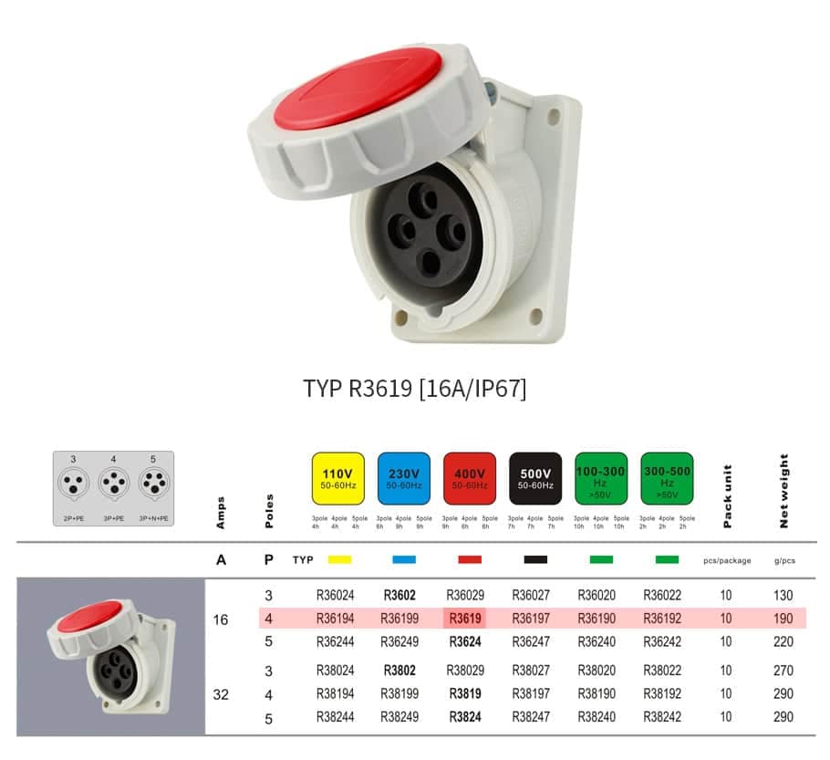 16A 4PIN Angled Panel Mount Socket TYPR3619-IP67