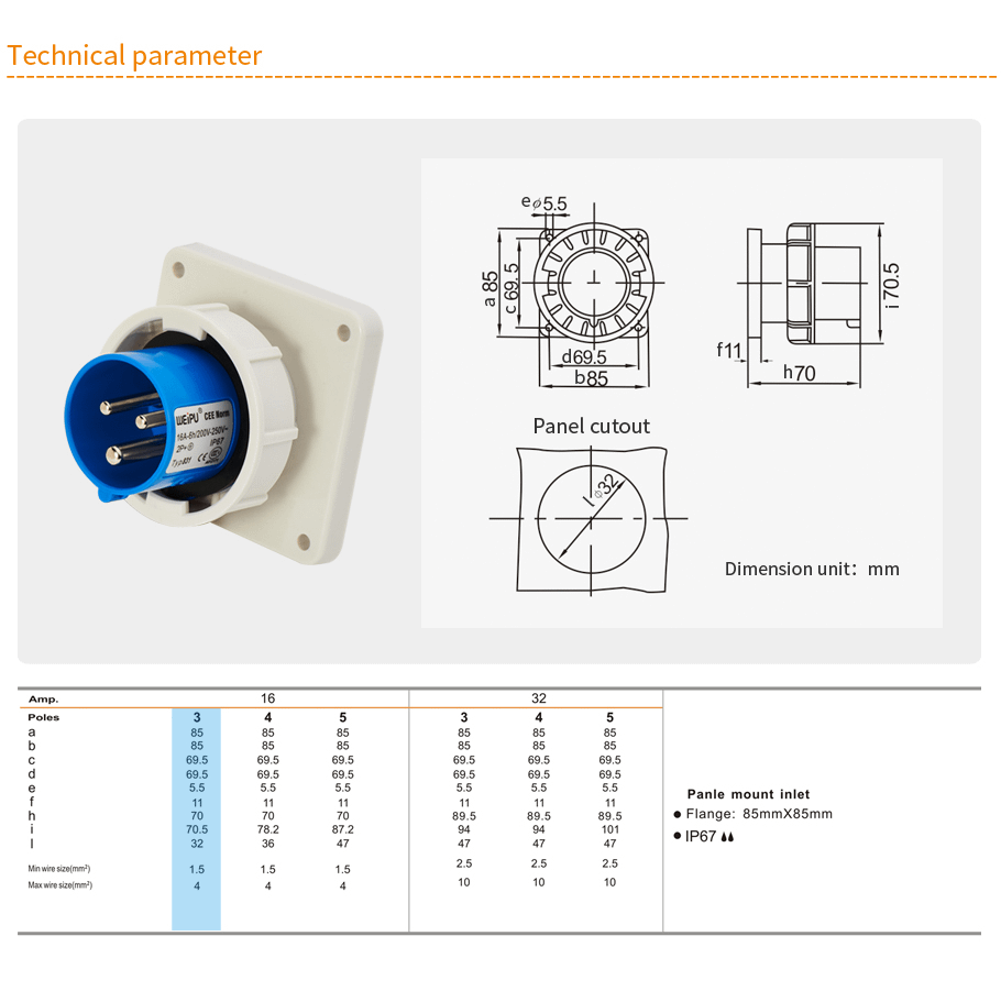 16A 3PIN Panle Mount Inlet TYP831-IP67