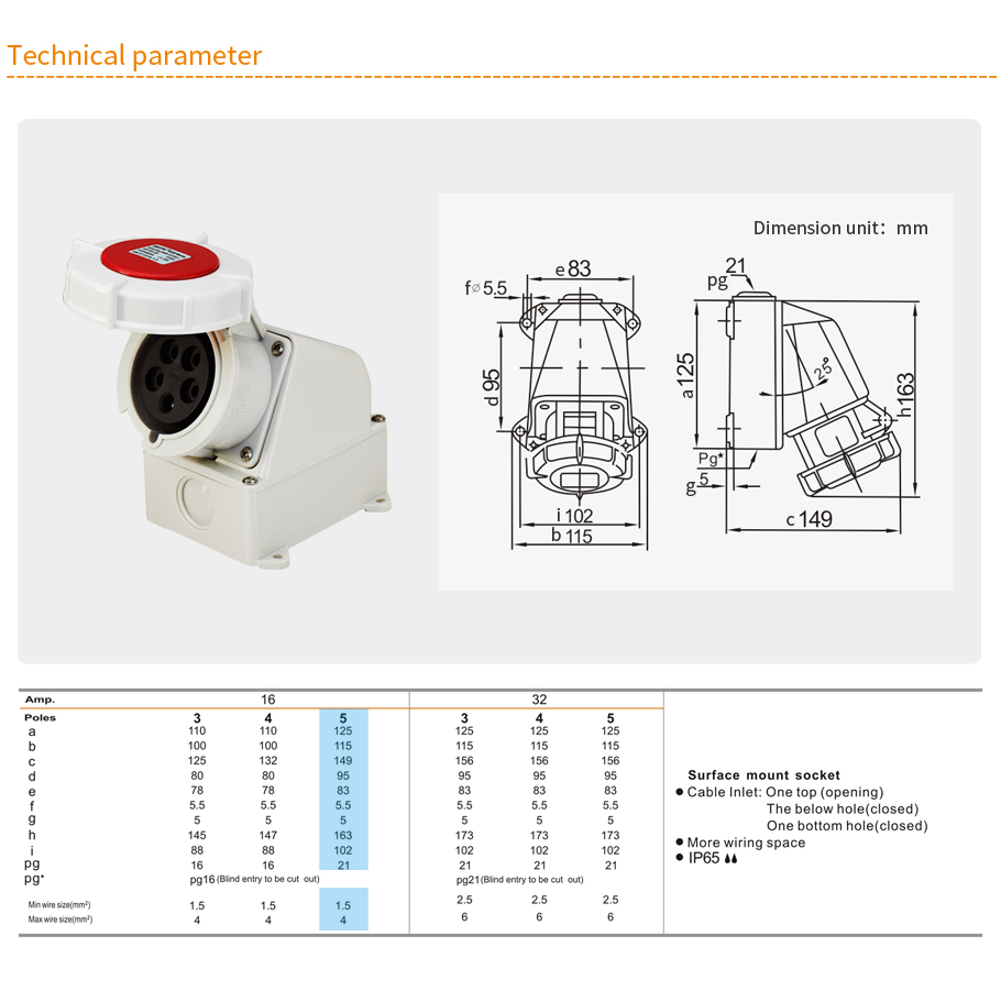 16A 5PIN Surface Mount Socket TYP6624-IP65