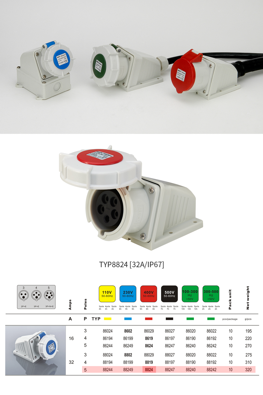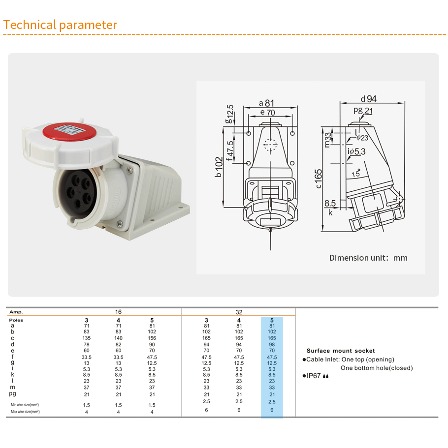 32A 5PIN Surface Mount Socket TYP8824-IP67