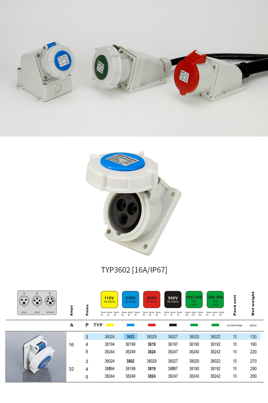 16A 3PIN Angled Panel mount socket TYPR3602-IP67