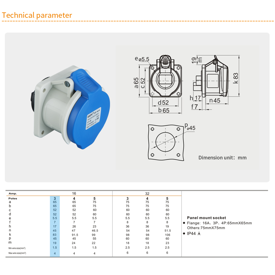 16A 3PIN Panel mount socket TYPR5601-IP44