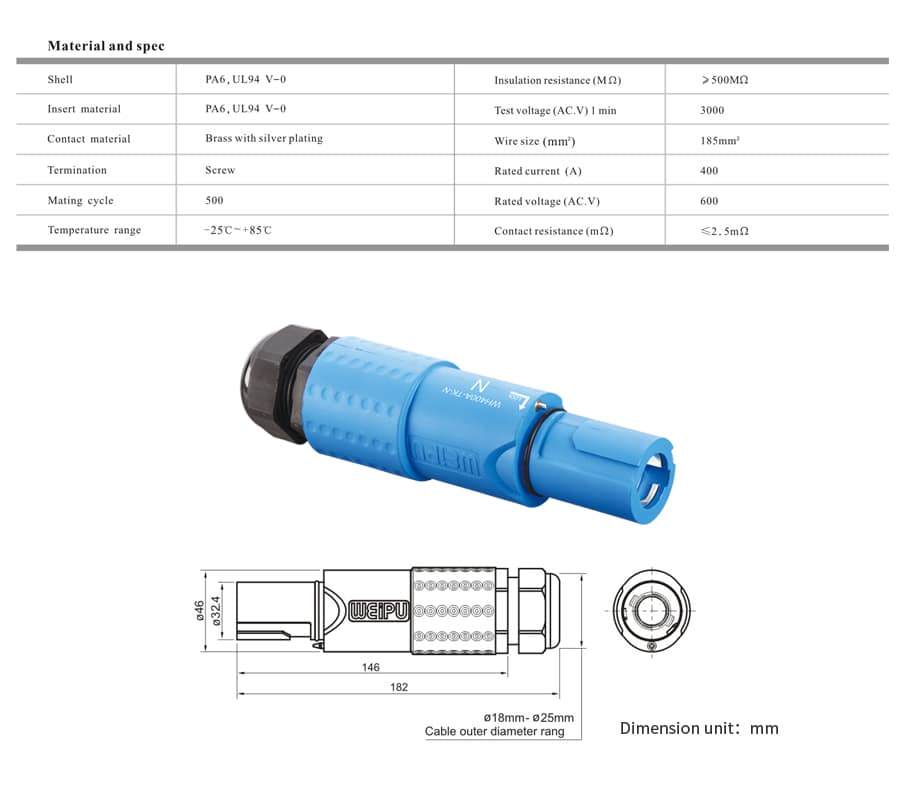 | Contact material | Brass with silver plating | Wire size (mm²) | 185mm² |