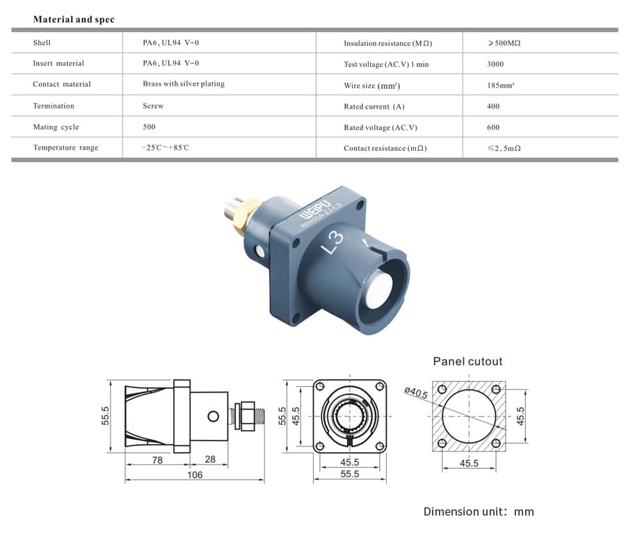 Home|Industrial Connector|WH400A|400Amp Female-contact socket WH400A-ZK-L3 IP67